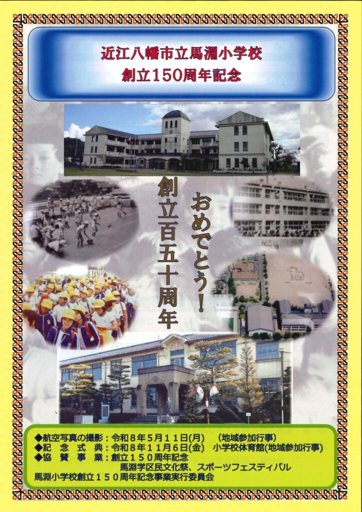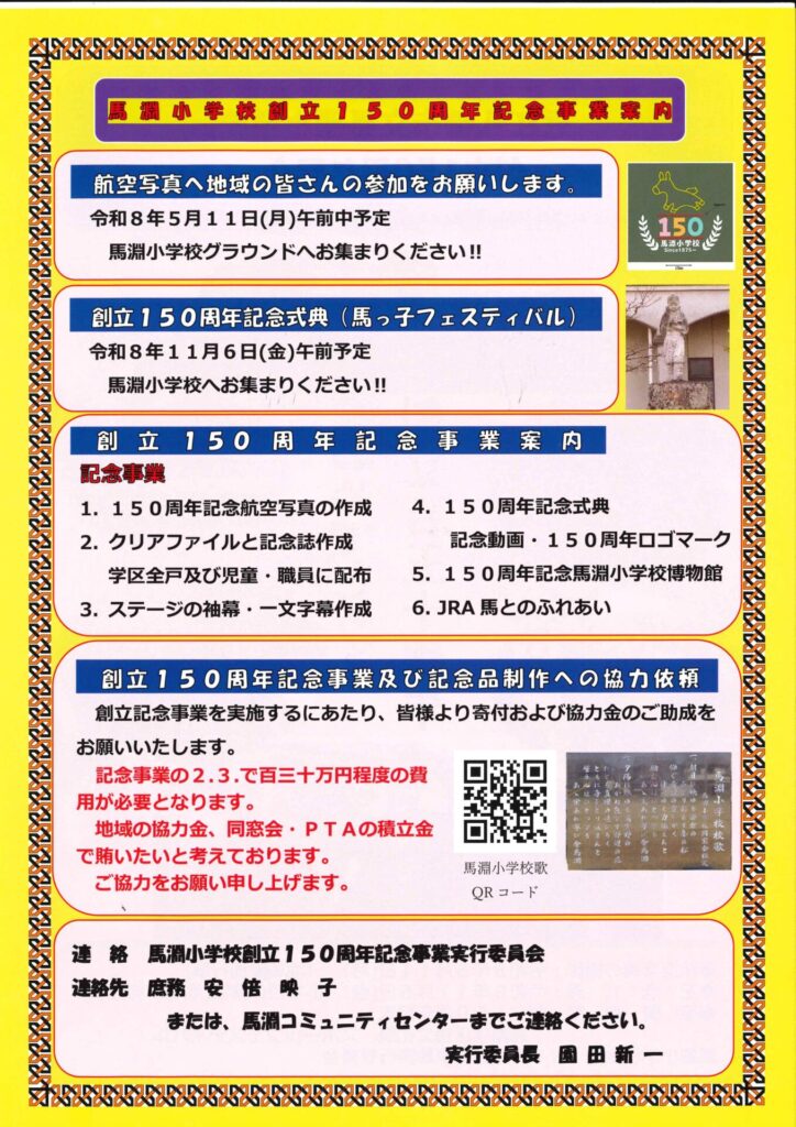 馬淵小学校創立150周年記念事業を行います 2026.04.23 ◆航空写真の撮影:令和8年5月11日(月)(地域参加行事) ◆記念式典 :令和8年11月6日(金) 小学校体育館(地域参加行事) -馬淵小学校創立150周年記念事業実行委員会-